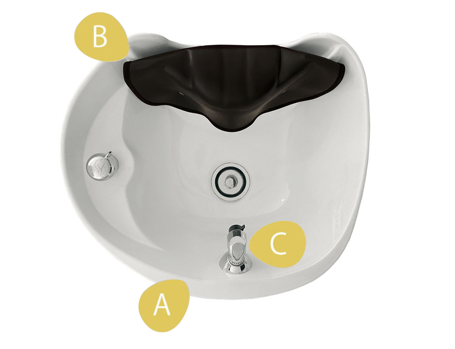 従来品のシャンプーボウルと比較し、約8~9cmも深いシャンプーボウル。 ロングヘア―を考慮した大容量。カラーシャンプーやパーマのすすぎの際に水圧を強くしても 水はねがほとんどありませんので安心して施術できます。