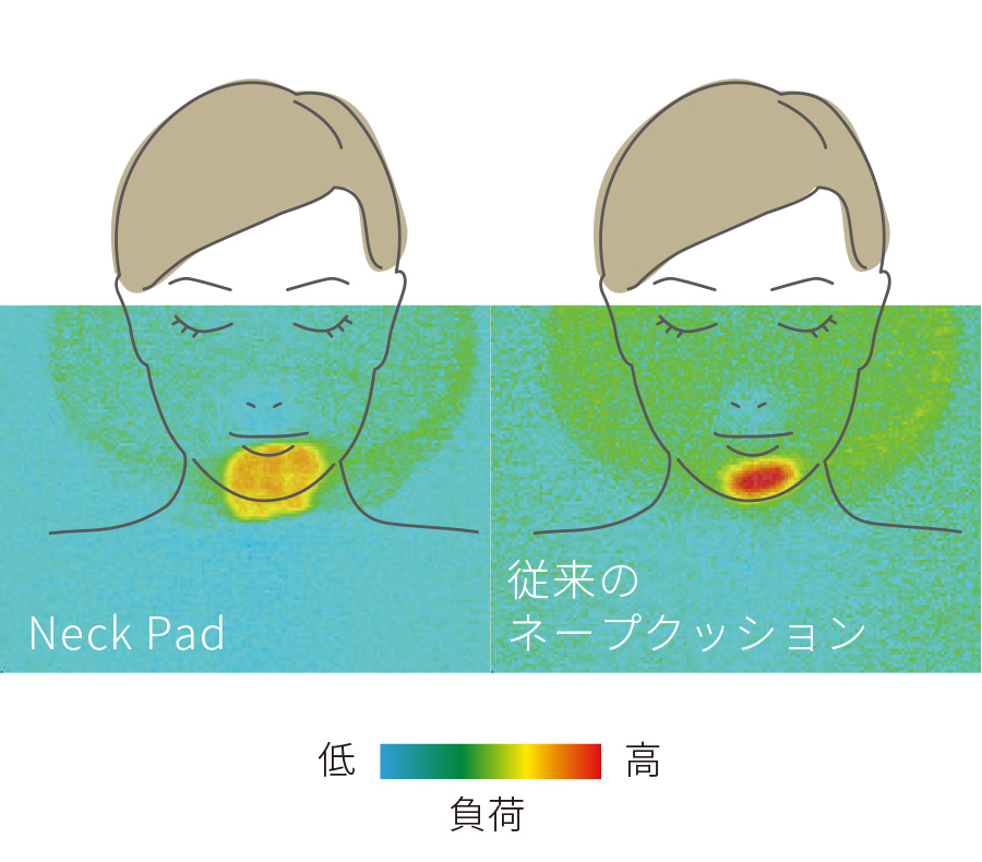 従来のネープクッションは首の狭い部分に圧力が集中し、それがストレスになっていました。“Neck Pad” は上下方向だけでなく、様々な方向から首にかかる圧力を広範囲に分散し、首のシビレ感を軽減します。