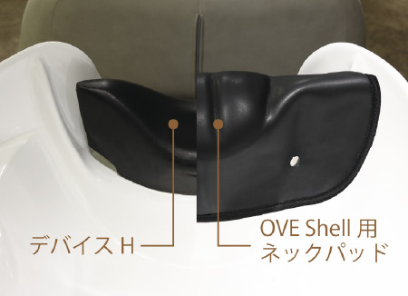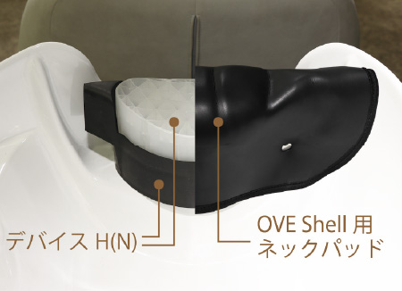 圧力がかかると流動体のようにプレッシャーを分散し、圧力から解放されると元の形にゆっくり戻る、衝撃吸収に優れた“ハイブリッド ・ ゲル” を使用した大型ネックパッドです。従来のネープクッションは首の狭い部分に圧力が集中し、それがストレスになっていました。「OVE Shell専用ネックパッド」は圧力を広範囲に分散し、首のシビレ感を軽減します。