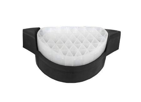 TPE(熱可塑性エラストマー)素材が持つ弾力性と、ハニカム構造(六角形)よりもあらゆる方向からの圧力分散効率を高めるためにトライアングル構造(三角形)のグリッドを採用している点が特徴です。